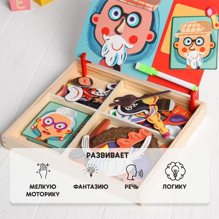 Фантазируйте и собирайте разные рожицы из элементов конструктора вместе с ребёнком, ведь это так весело! Карточки с подсказками помогут сориентироваться в разнообразии деталей. Обсудите с малышом разницу между выражениями лица, формами носа и причёсками.