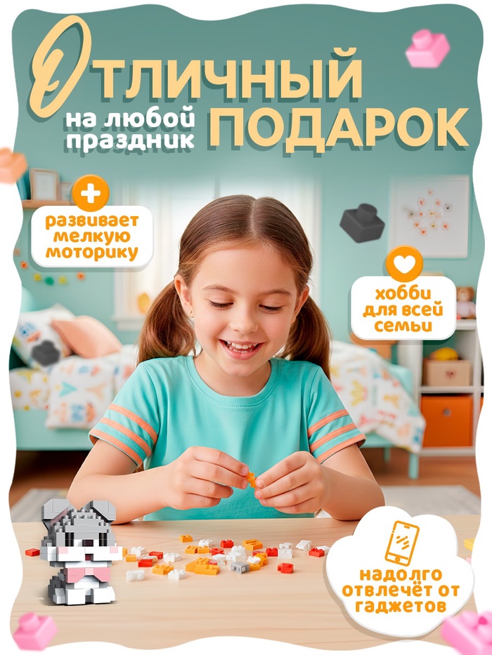 - 232 мини-детали для детализированной сборки: мелкие блоки помогают передать форму тела, ушей и хвоста. Работа с небольшими элементами развивает точность движений и терпение.