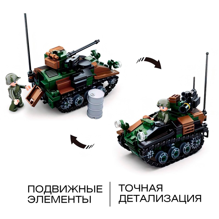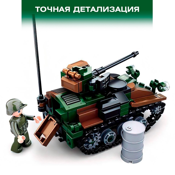 - 2 варианта сборки: Набор предлагает два разных способа сборки, что добавляет разнообразия и увеличивает игровую ценность. Ребенок может выбрать, какую модель танка он хочет собрать.