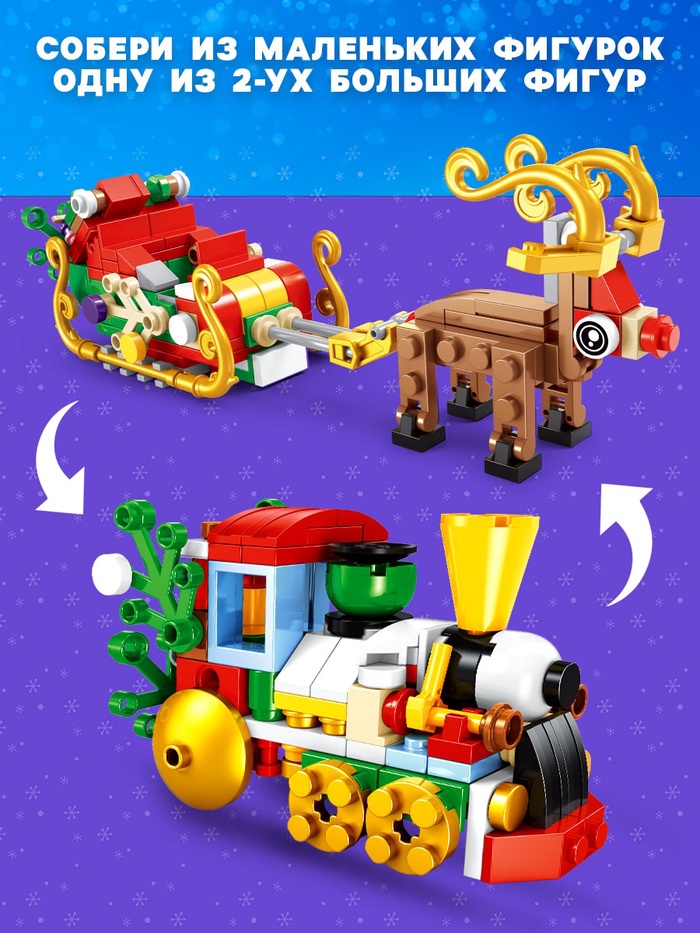 - Две крупные модели: объедините детали, чтобы собрать большую фигуру оленя с санями или внушительный новогодний поезд. Это особенный творческий опыт и гордость за результат.