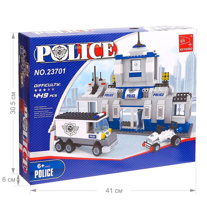 - Набор содержит 449 деталей и позволяет сконструировать полицейский участок, броневик, автомобиль спецслужбы и фигурки стражей порядка и заключённого.