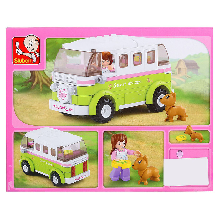 С набором торговой марки Sluban малышка сконструирует комфортабельный микроавтобус и отправится в захватывающее путешествие по стране. Девочка возьмёт с собой озорную собачку, она будет тренировать пёсика на природе, метать ему диск и учить командам.