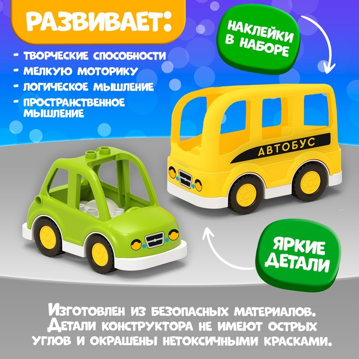 С конструктором «Транспорт» ребёнок сможет почувствовать себя водителем настоящего транспортного средства! В комплекте есть легковой автомобиль и автобус. Проработанные и яркие детали привлекут внимание ребёнка, сделают игру интересной.