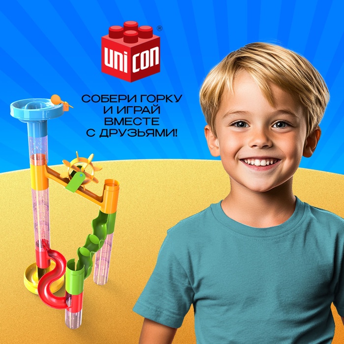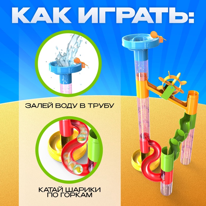 Набор состоит из прозрачных трубочек, разноцветных мостиков, извилистых дорожек и мельниц. Малыш без труда соорудит трассу любой длины и сложности и будет следить за перемещениями шариков.