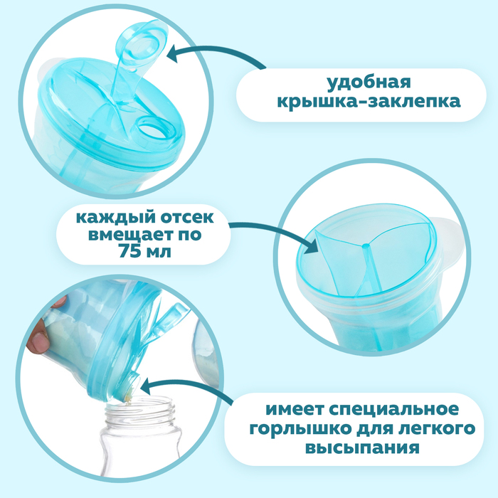 Контейнер подходит для хранения детского питания . Благодаря плотно закрывающейся крышке и ложке удобно пользоваться как дома, так и в дороге. Компактная ложечка позволяет заранее отмерять и хранить определенное количество сухой смеси. Такой контейнер позволит вам быстро и без задержек приготовить питательную смесь для малютки. Выполнено из безопасных материалов.