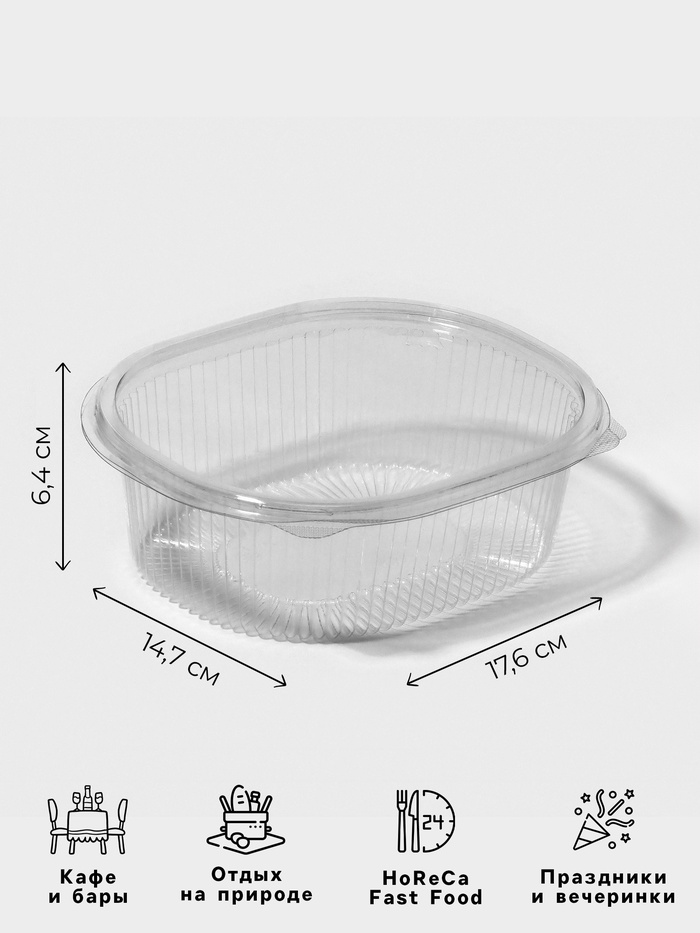 Прозрачный пластиковый контейнер с крышкой — простое решение для хранения и транспортировки еды. Удобный размер 17,6×14,7×6,4 см и объем 750 мл подходят для порционных блюд, снеков или полуфабрикатов. Прямоугольная форма экономит место в сумке или холодильнике.
