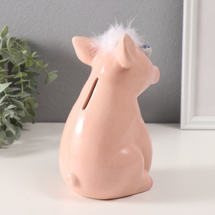Копилка выполнена из качественной керамики и покрыта глазурью, что придаёт ей блеск и долговечность. Высота копилки составляет 17 см, что делает её заметной и привлекательной. Оригинальный дизайн с искусственным мехом добавляет тактильное удовольствие, а розовый цвет создаёт позитивное настроение.