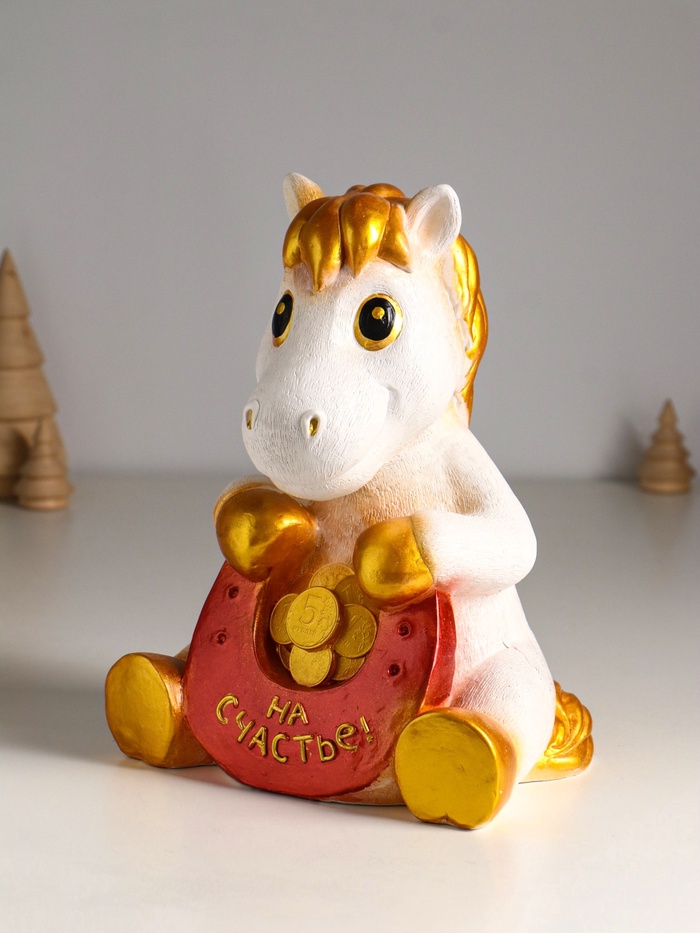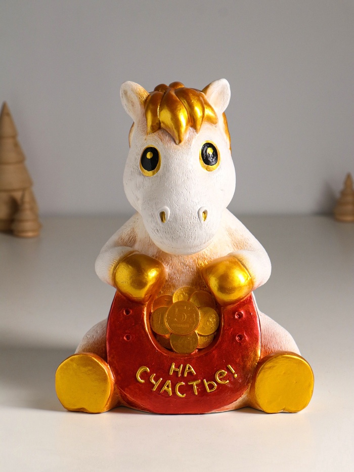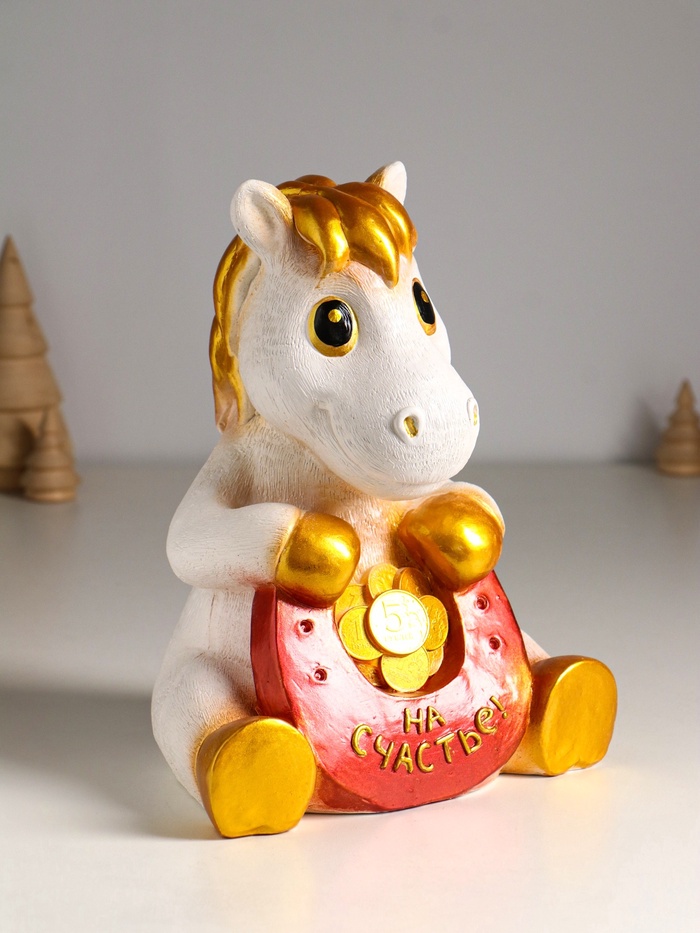 Эта белоснежная гипсовая копилка в виде лошади станет особым подарком, который принесёт в дом не только красоту, но и ощущение стабильности. Образ сильного и благородного животного с подковой на удачу напоминает о поддержке и верном пути к финансовым целям.
