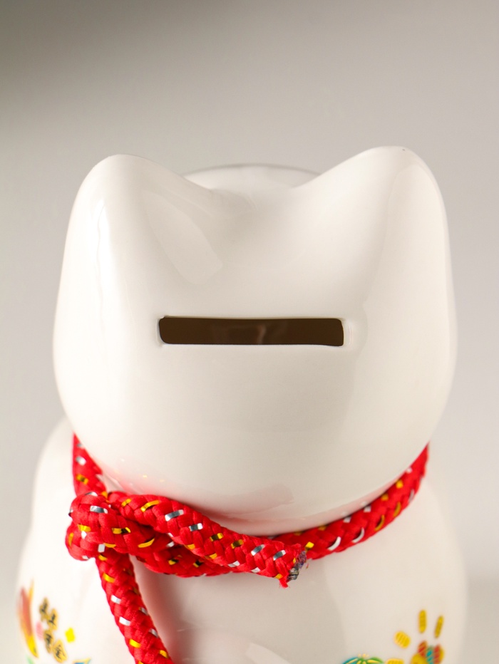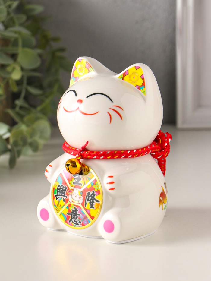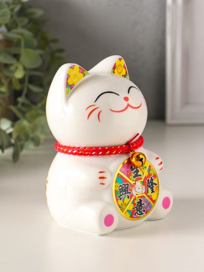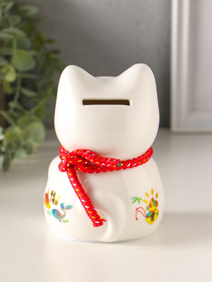 Эта керамическая копилка в виде знаменитого японского кота с поднятой лапой — символ, что в доме всегда будут водиться деньги. Белоснежная фигурка с яркими, жизнерадостными акцентами и традиционным барабаном создаёт ощущение праздника и удачи. Каждый раз, опуская монету в открытую прорезь, вы не просто откладываете деньги, а совершаете маленький ритуал на привлечение благополучия.