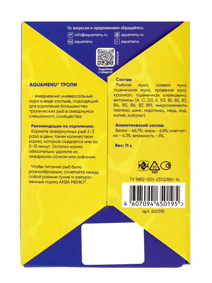 Универсальный корм для всех видов рыб. Витамины и компоненты животного и растительного происхождения обеспечивают здоровье всего организма. Корм легко усваивается. Следите, чтобы корм был полностью съеден за несколько минут. Помните, что остатки еды загрязняют воду и могут служить причиной заболеваний питомцев.