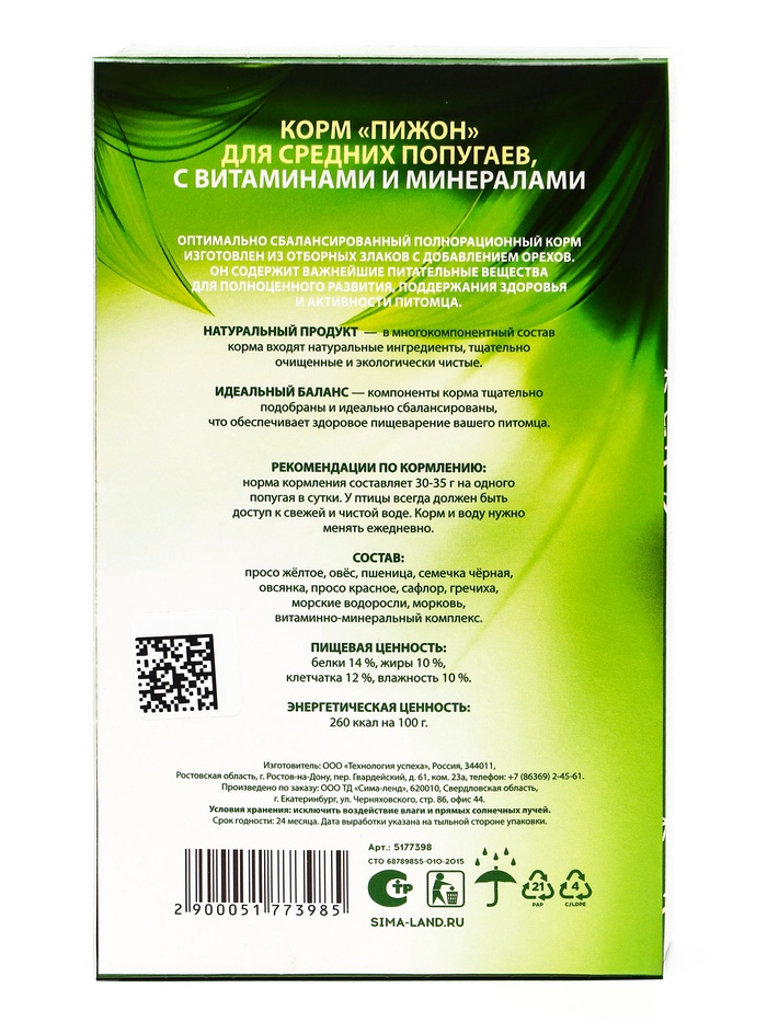 Состав: просо желтое, овёс, пшеница, семечка чёрная, овсянка, просо красное, сафлор, гречиха, морские водоросли, морковь, витаминно-минеральный комплекс.
