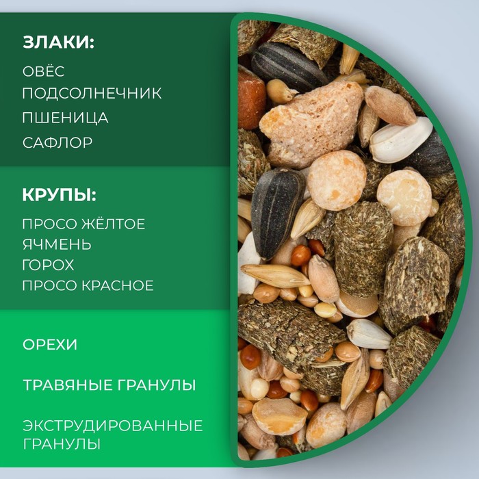 Состав: пшеница, овёс, просо жёлтое, сафлор, просо красное, ячмень, подсолнечник, горох, кукуруза, экструдированные гранулы, травяные гранулы, орехи.
