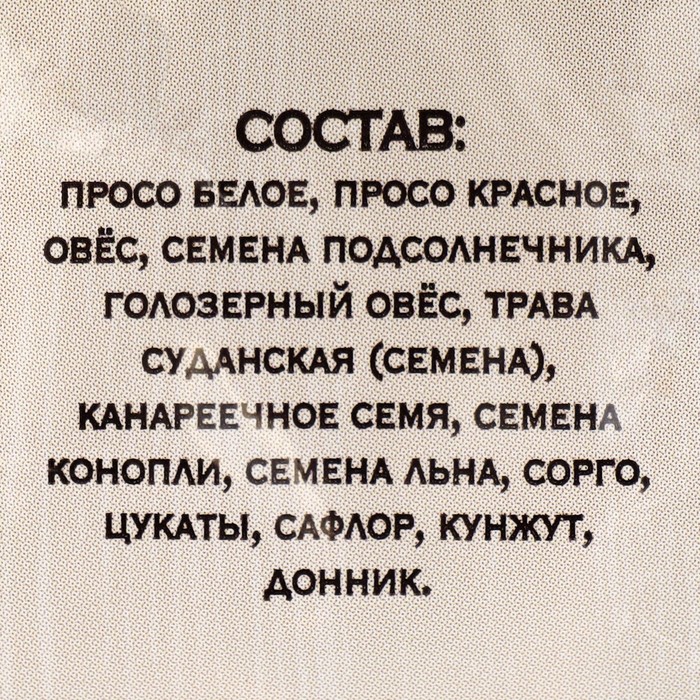 СОСТАВ: Просо красное, просо белое, овес, овес очищенный, канареечник, лен, конопля, суданка, семена подсолнечника, сорго, сафлор, цукаты, кунжут, витаминный комплекс.