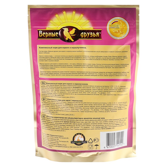 - Употребление корма гарантирует вашему питомцу здоровый рост и красивое оперение.