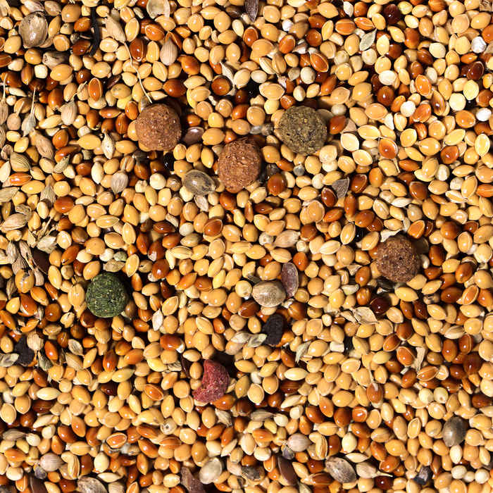 Состав: Просо жёлтое, просо красное, просо белое, чумиза, овсянка, семя льна, канареечное семя, семя суданки, рапс, морская капуста, кунжут, овёс/