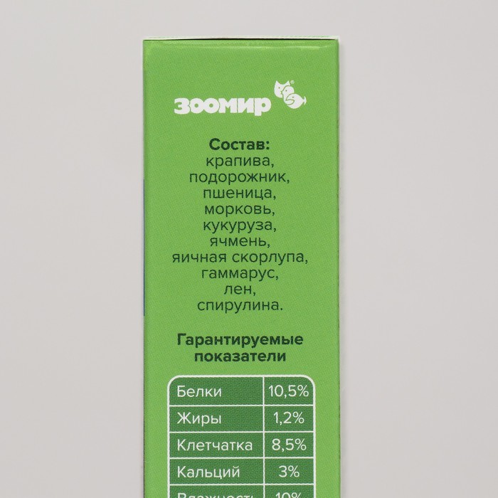 Состав: крапива, подорожник, пшеница, морковь, кукуруза, ячмень, яичная скорлупа, гаммарус, лен, спирулина.