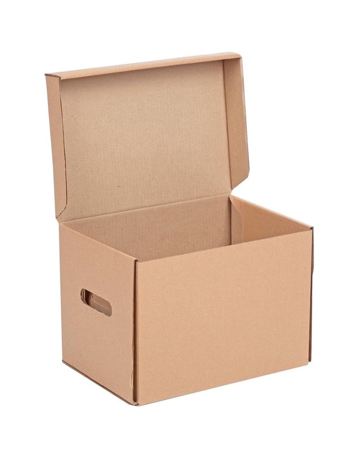 Он сделан из высококачественного бурого гофрокартона и способен выдерживать вес до 15–18 килограммов. У короба есть откидная крышка и отверстия по бокам для удобной переноски. Размер — 325235325 мм. Поставляется в разобранном виде и легко собирается без скотча и ножниц.
