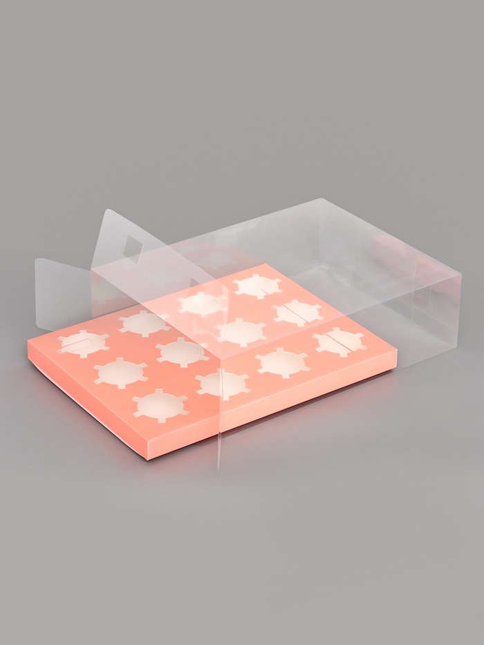 Упаковка для капкейков. Изготовлена из плотного картона и PVC. Используют для упаковки и транспортировки капкейков при доставке. Благодаря окошку можно рассмотреть товар внутри коробки, не открывая ее.