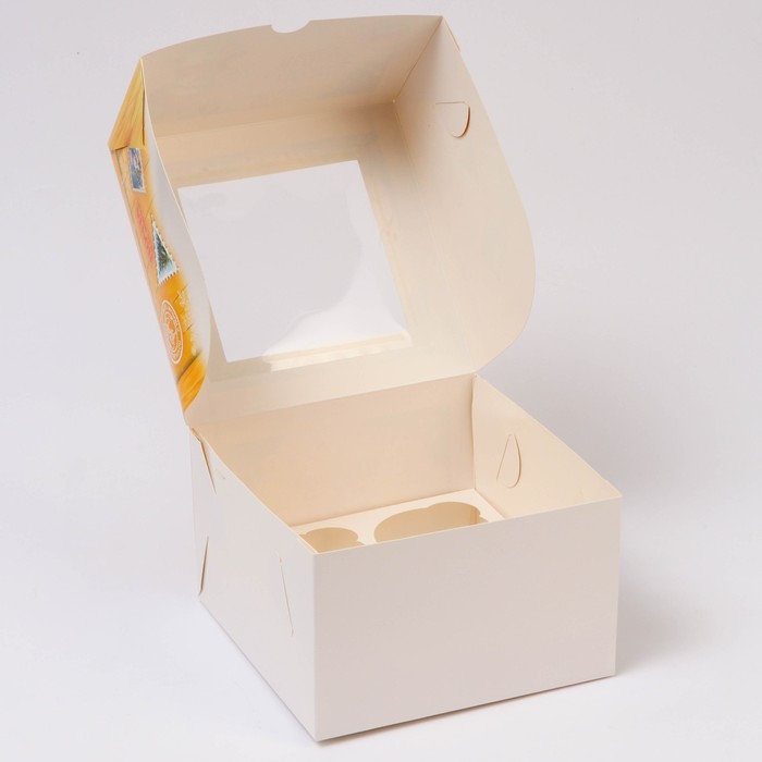 Коробка выполнена из прочного картона и украшена новогодним дизайном. Специальные вставки внутри коробки надежно фиксируют капкейки, защищая их от смещения и повреждений.