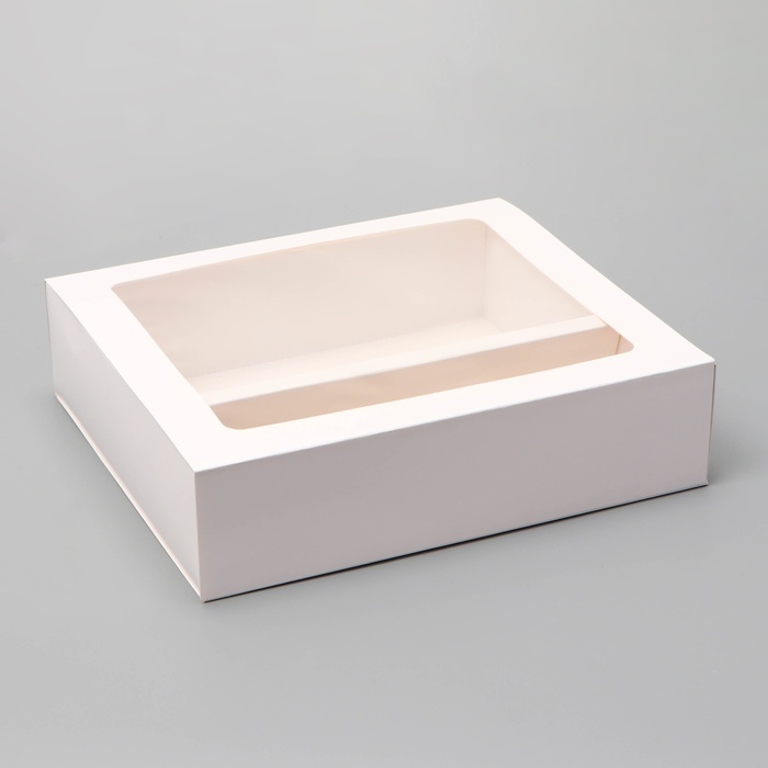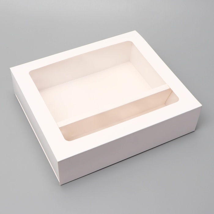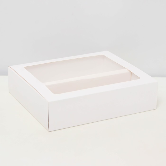 Коробка для кондитерских изделий имеет размеры 22,1 см в длину, 25,5 см в ширину и 6,5 см в высоту. Она выполнена из белого картона высокого качества, что обеспечивает прочность и долговечность.