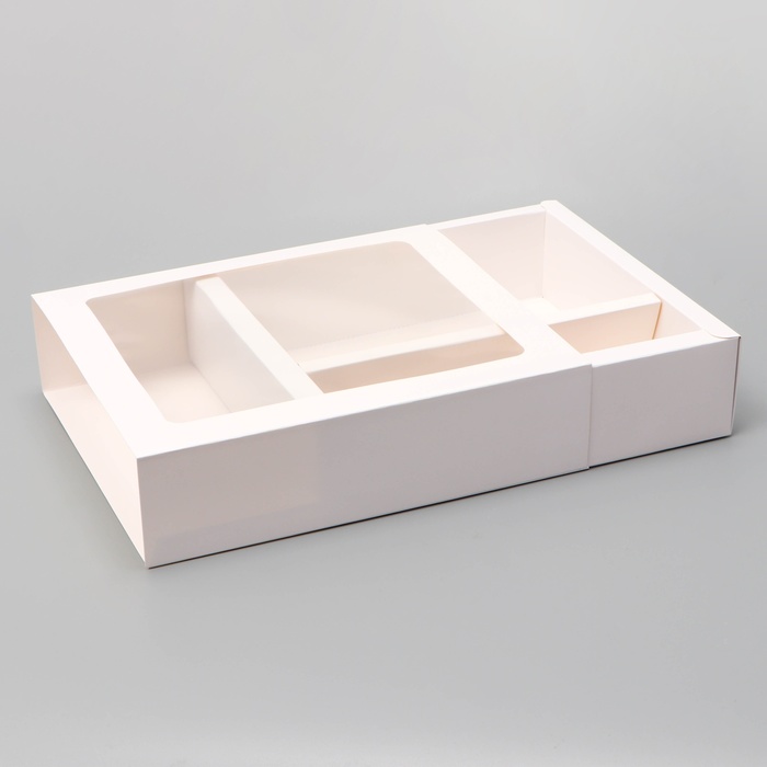 Белый цвет коробки придает ей элегантный и классический вид, что делает ее подходящей для различных событий, включая свадьбы, дни рождения и корпоративные мероприятия.