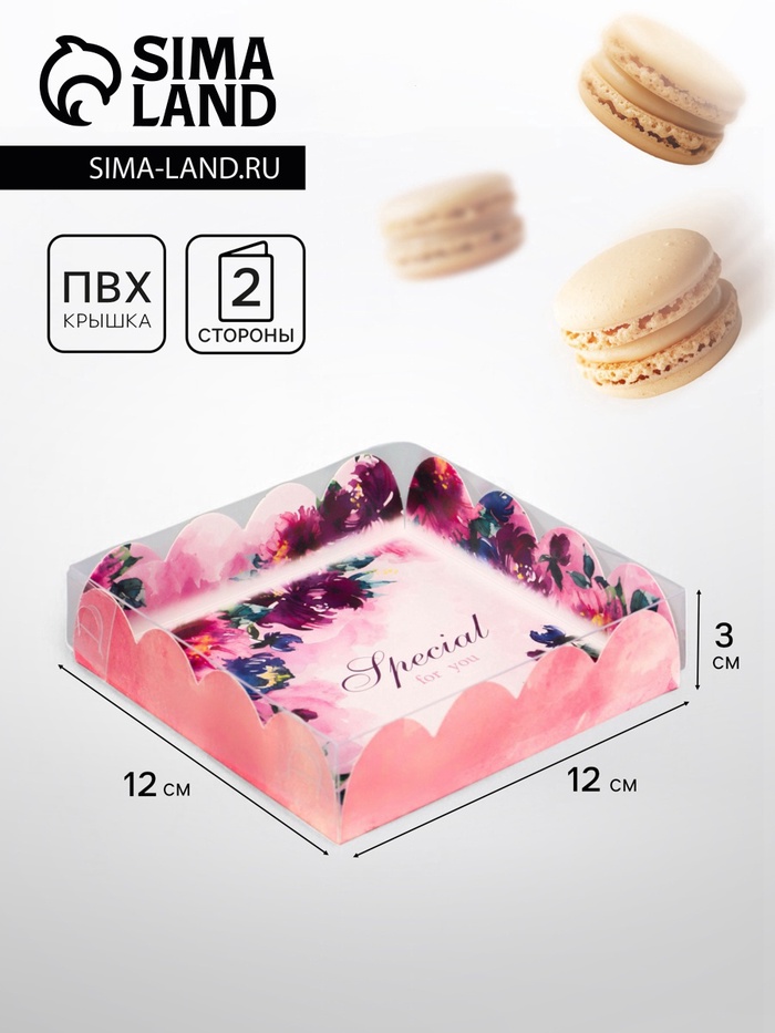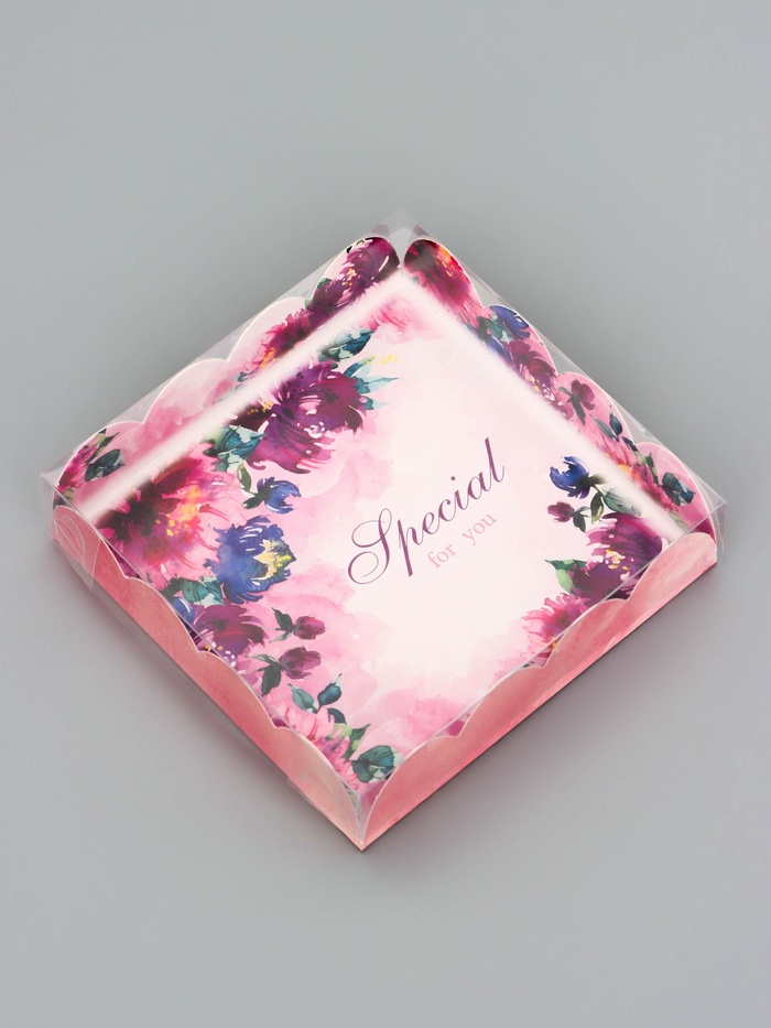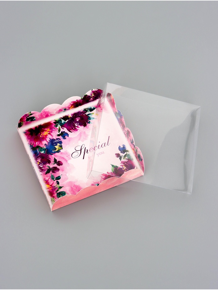 Прочный картон обеспечивает надежную защиту содержимого, а прозрачная крышка позволяет сразу оценить внешний вид угощений без необходимости открывать коробку.