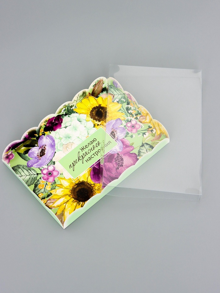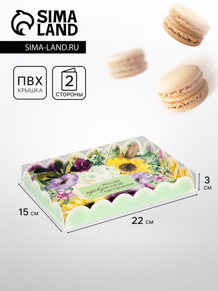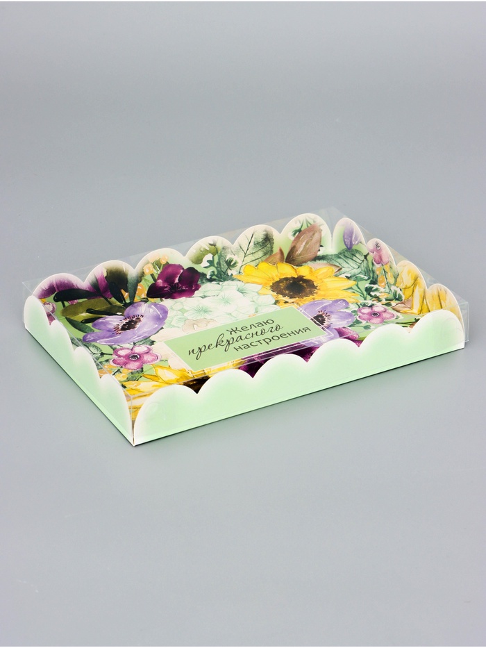 Прочный картон обеспечивает надежную защиту содержимого, а прозрачная крышка позволяет сразу оценить внешний вид угощений без необходимости открывать коробку.