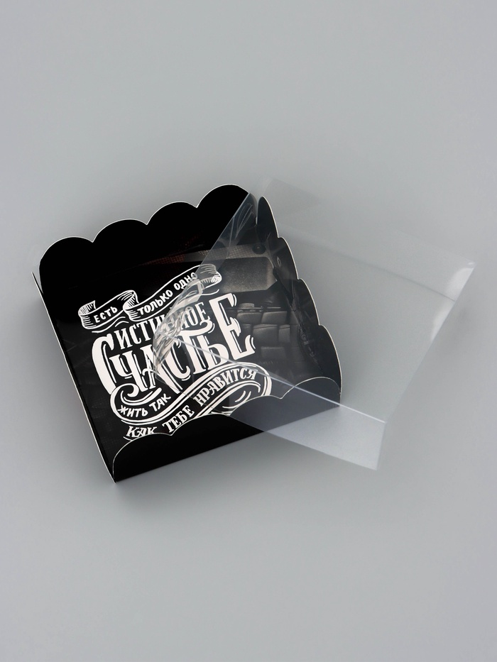 Прочный картон обеспечивает надежную защиту содержимого, а прозрачная крышка позволяет сразу оценить внешний вид угощений без необходимости открывать коробку.
