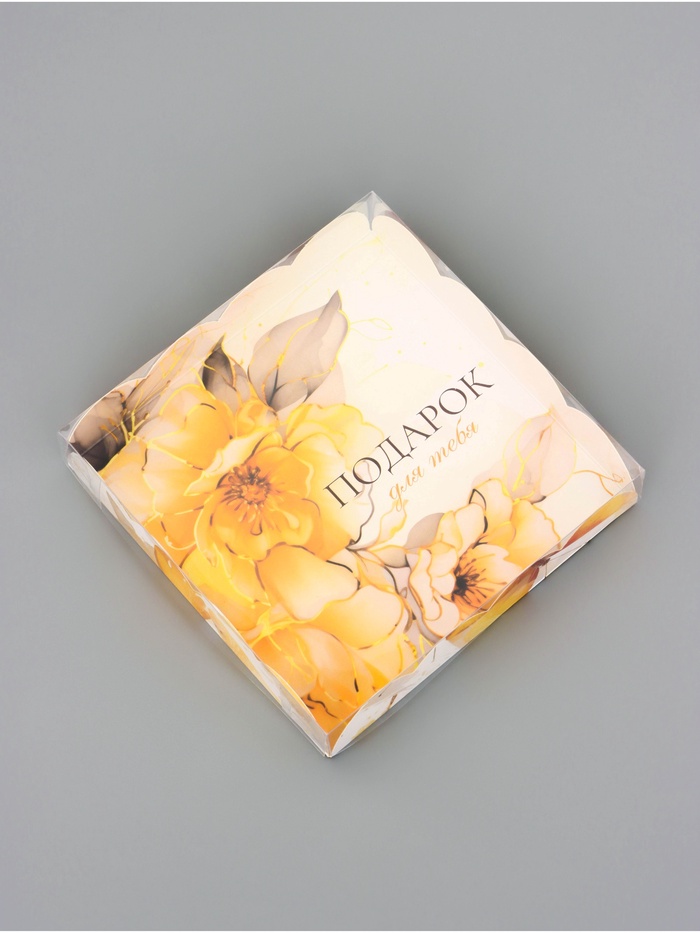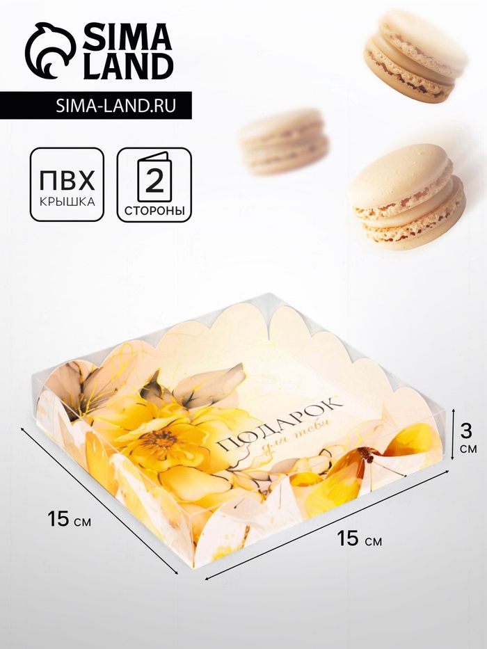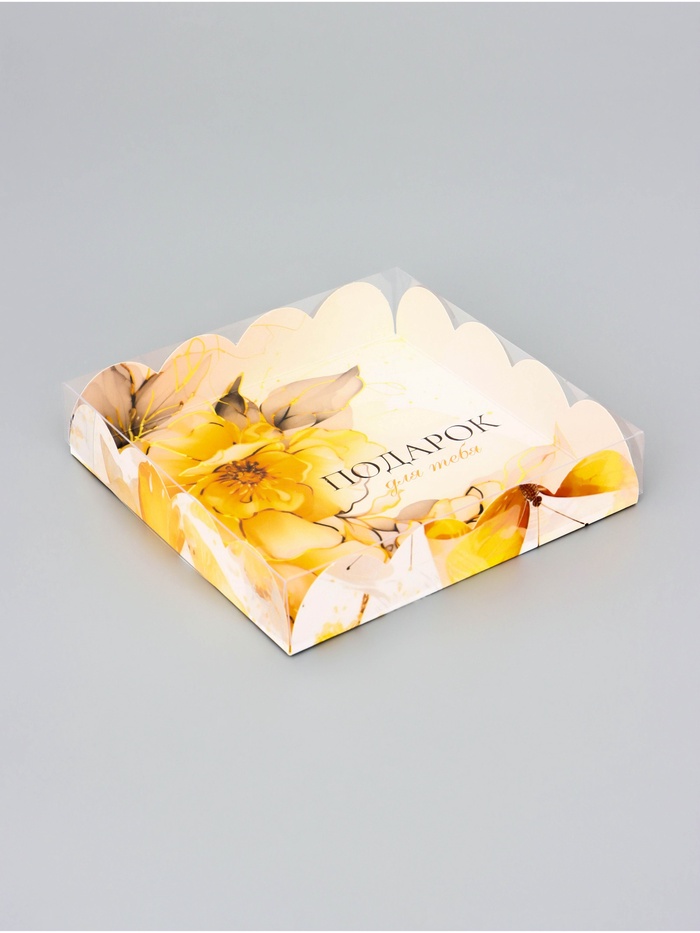 Прочный картон обеспечивает надежную защиту содержимого, а прозрачная крышка позволяет сразу оценить внешний вид угощений без необходимости открывать коробку.