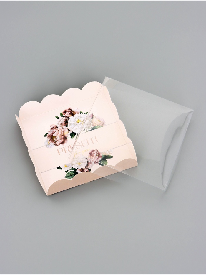 Прочный картон обеспечивает надежную защиту содержимого, а прозрачная крышка позволяет сразу оценить внешний вид угощений без необходимости открывать коробку.