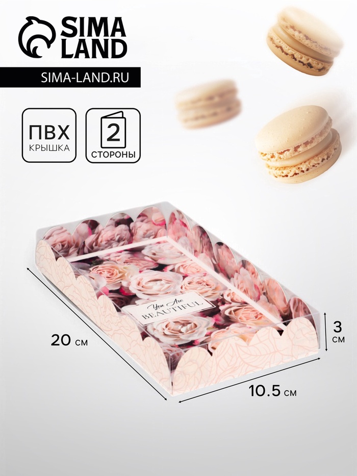 Прочный картон обеспечивает надежную защиту содержимого, а прозрачная крышка позволяет сразу оценить внешний вид угощений без необходимости открывать коробку.