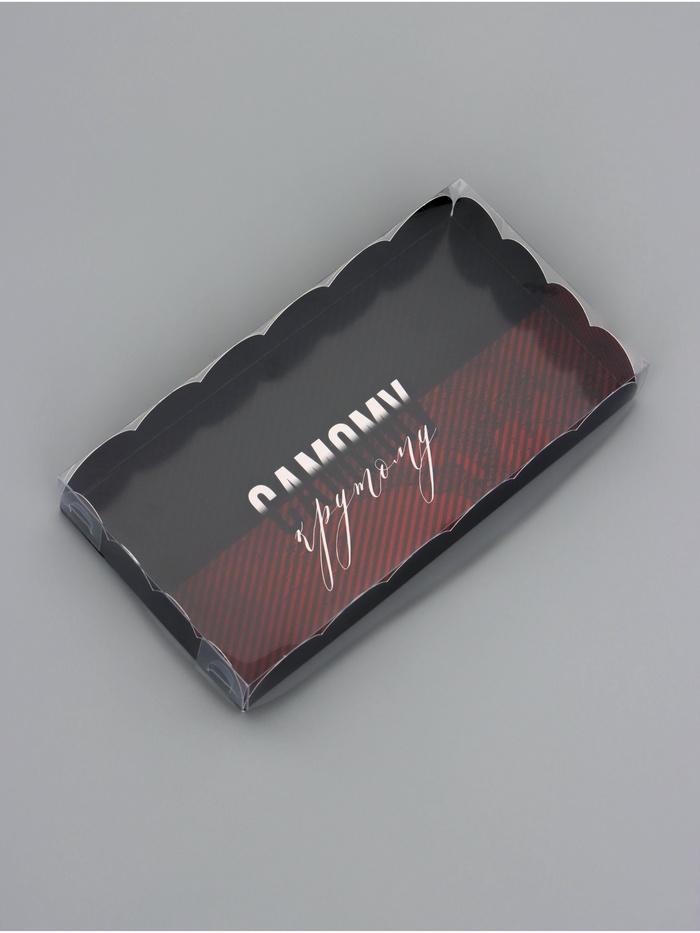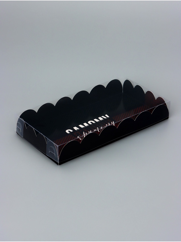 Прочный картон обеспечивает надежную защиту содержимого, а прозрачная крышка позволяет сразу оценить внешний вид угощений без необходимости открывать коробку.