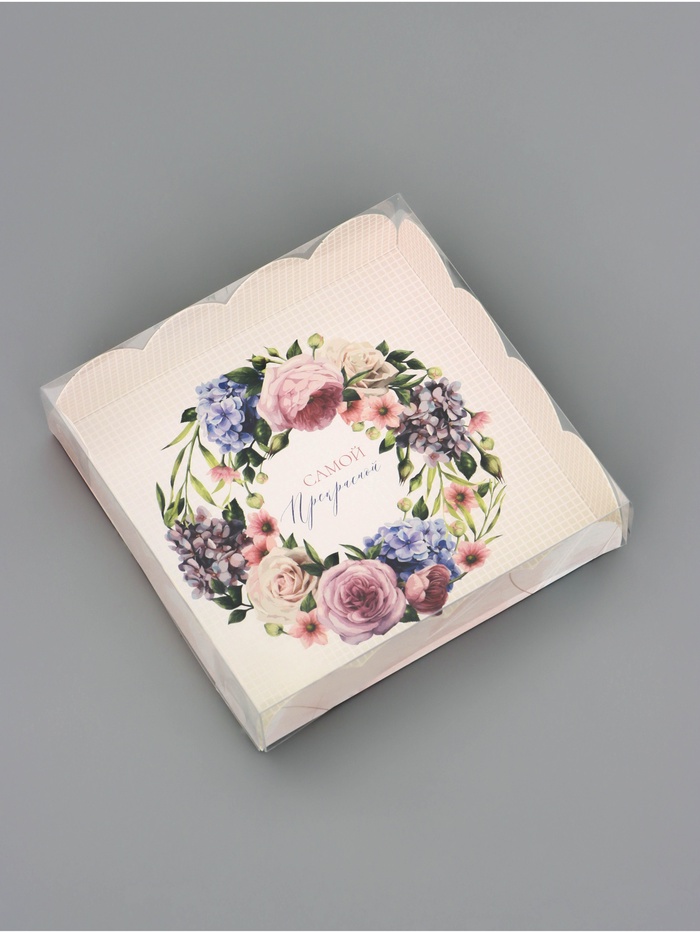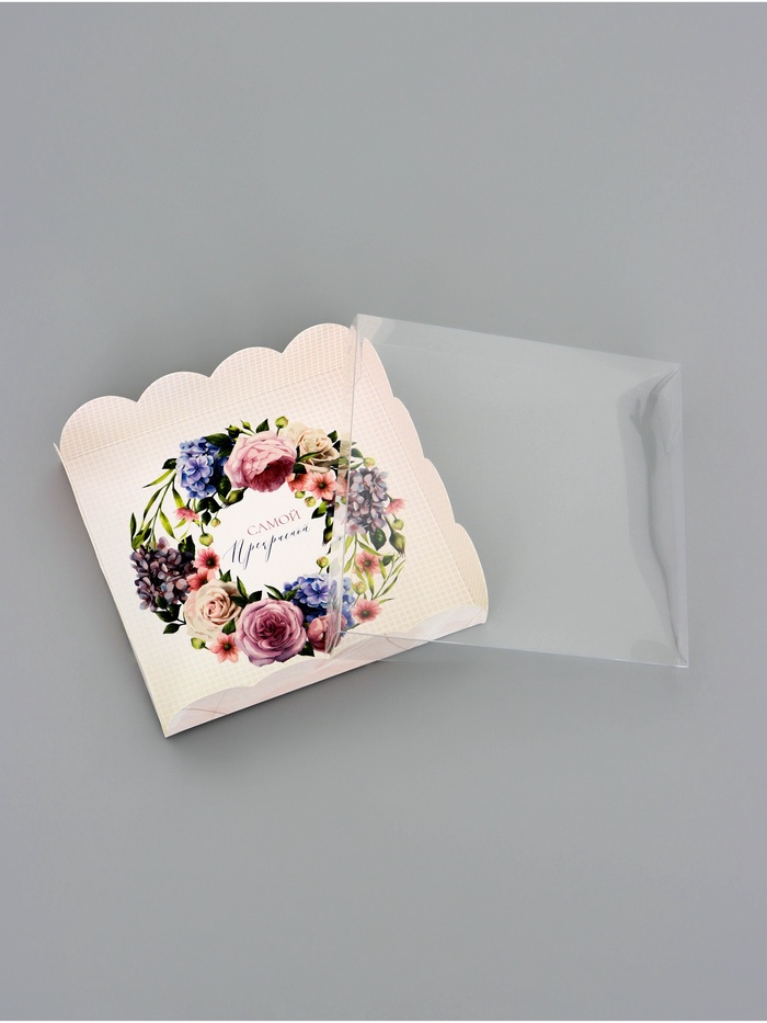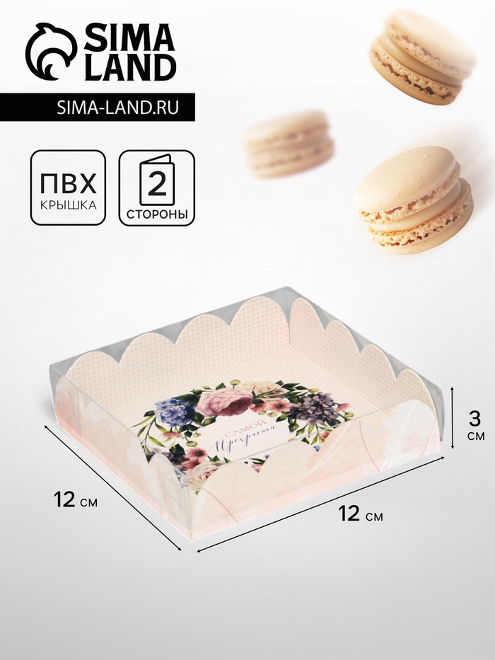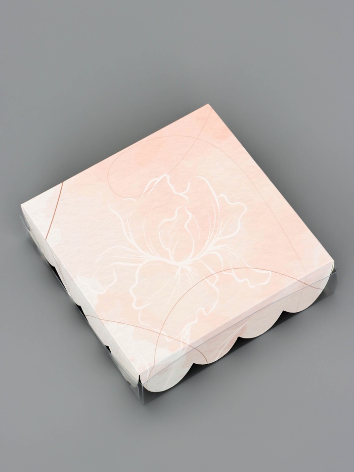 Прочный картон обеспечивает надежную защиту содержимого, а прозрачная крышка позволяет сразу оценить внешний вид угощений без необходимости открывать коробку.