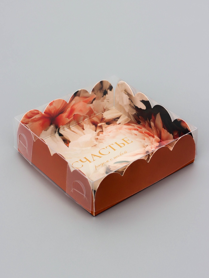 Прочный картон обеспечивает надежную защиту содержимого, а прозрачная крышка позволяет сразу оценить внешний вид угощений без необходимости открывать коробку.