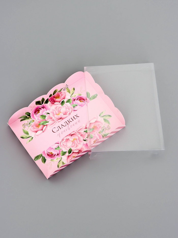 Прочный картон обеспечивает надежную защиту содержимого, а прозрачная крышка позволяет сразу оценить внешний вид угощений без необходимости открывать коробку.