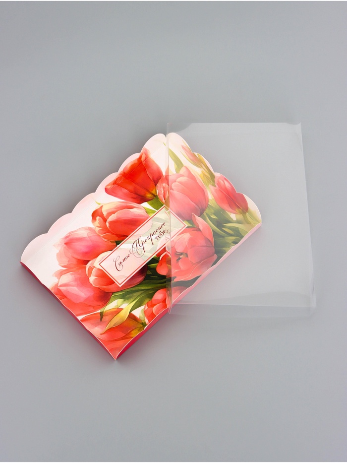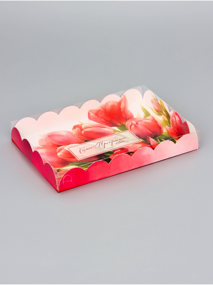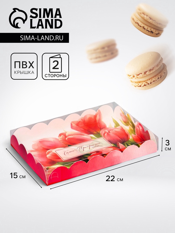 Прочный картон обеспечивает надежную защиту содержимого, а прозрачная крышка позволяет сразу оценить внешний вид угощений без необходимости открывать коробку.