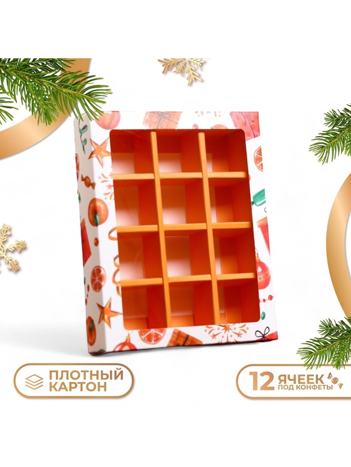 Размеры коробки позволяют упаковать 12 штук конфет, что делает ее удобной для использования в качестве подарка или для домашнего использования. Коробка изготовлена из качественного картона, который обеспечивает надежную защиту содержимого от внешних воздействий.
