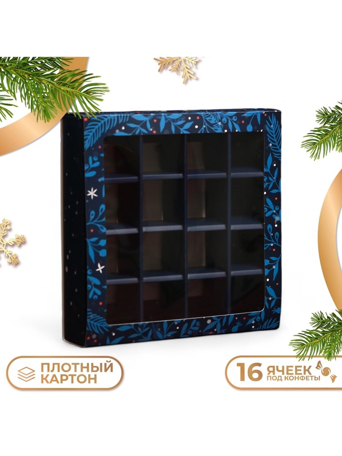 Коробка под 16 конфет "Новогодняя" размером 17,7х17,7х3,8 см - это прекрасный выбор для упаковки сладостей к празднику. Она выполнена в ярких новогодних цветах, что создает атмосферу праздника и волшебства.