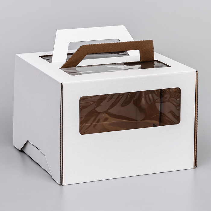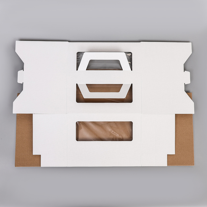 Надежная презентация для большого торта! Белая коробка для торта с двумя окнами и ручками — это профессиональное решение для переноски и демонстрации кондитерских изделий. Прочная конструкция из гофрокартона выдерживает вес до 5 кг, сохраняя десерт в идеальном состоянии.