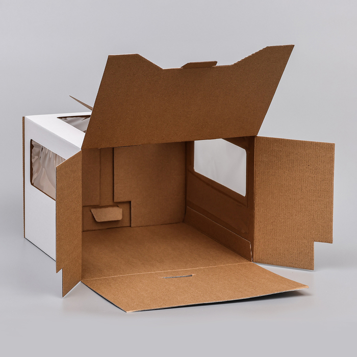 Прочность и функциональность: Складная конструкция из плотного гофрокартона обеспечивает устойчивость и защиту от деформации. Коробку легко собрать без дополнительных инструментов. Она надежно фиксирует торт внутри, предотвращая сдвиги при транспортировке. Это практичный выбор для кондитеров и тех, кто ценит надежность в деталях.