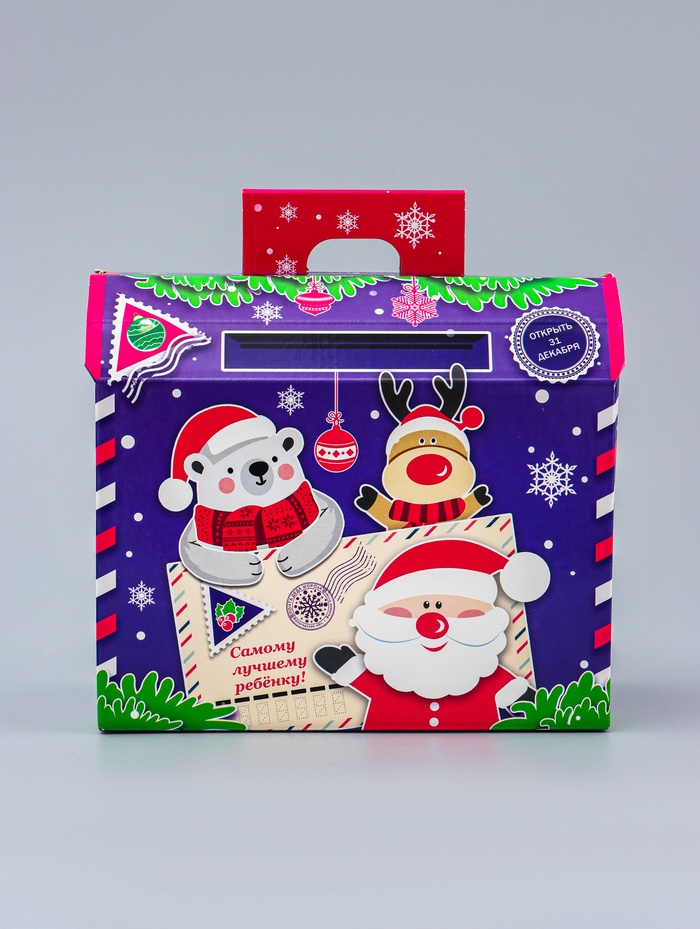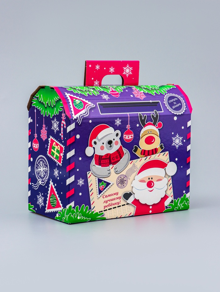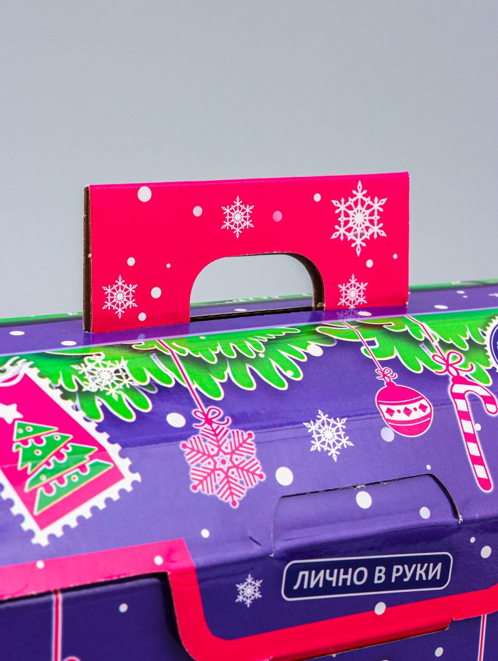 Отправьте праздничное настроение в необычной упаковке! Коробка «Почта» в фиолетовом цвете — это тематическая упаковка для новогодних подарков в виде почтового сундучка. Нестандартный фиолетовый фон с праздничными узорами и цифрами создаёт современный праздничный образ.