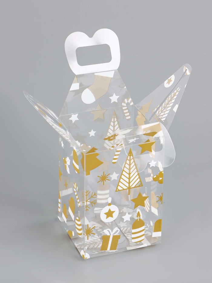 - Праздничный дизайн: Узор в виде ёлочек на прозрачном фоне выглядит нарядно и современно. Не требует дополнительного декора — содержимое прекрасно просматривается.