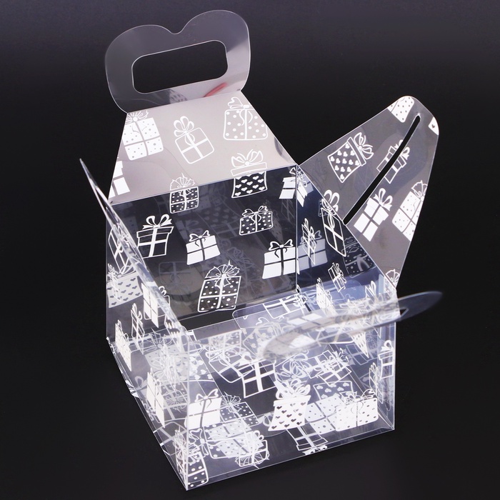 - Классический новогодний дизайн: Бело-прозрачные стенки с изображением подарков создают праздничную атмосферу. Универсальное оформление без символа года.