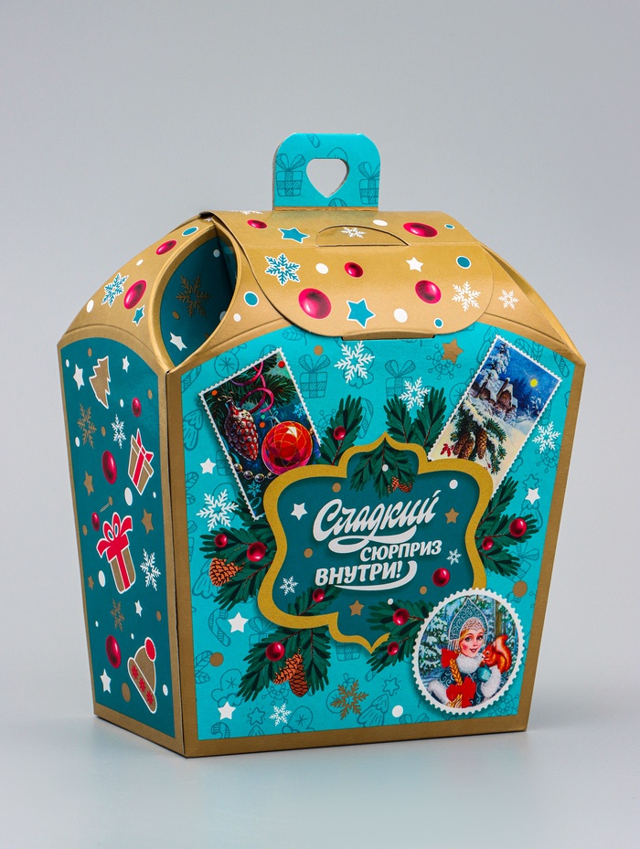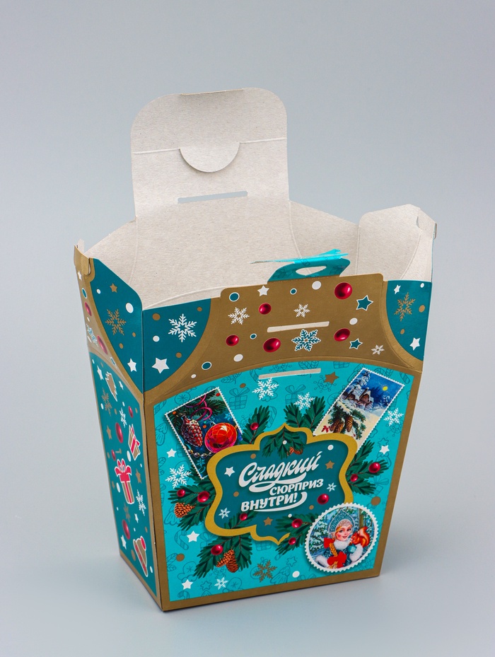 - Качественные материалы: Плотный картон с металлизированными элементами сохраняет форму и защищает содержимое. Упаковка выглядит нарядно и празднично.