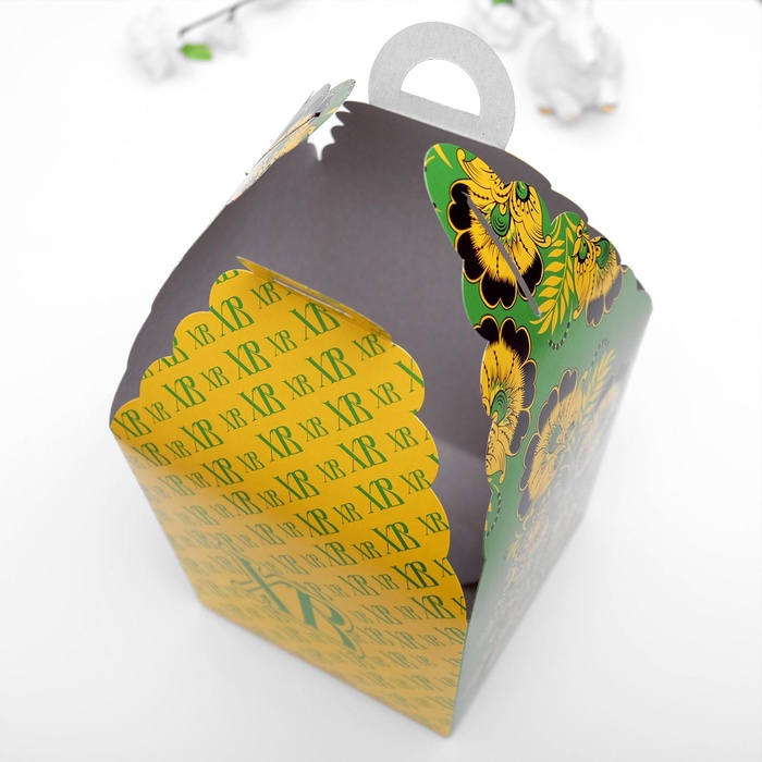 - Узнаваемый пасхальный дизайн: Орнамент в стиле хохломы, традиционные буквы «ХВ» и праздничная палитра из зеленого и желтого цветов сразу указывают на предназначение упаковки. Коробка сама по себе становится частью пасхального декора.