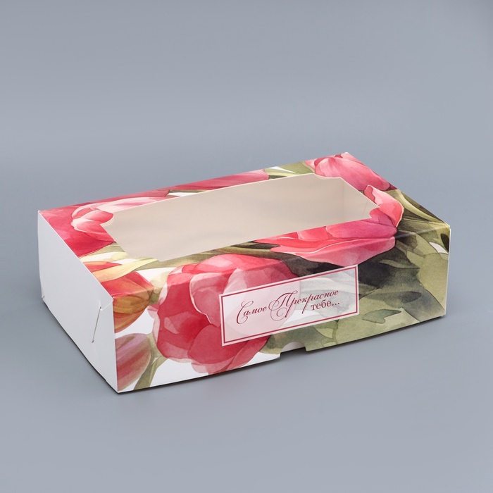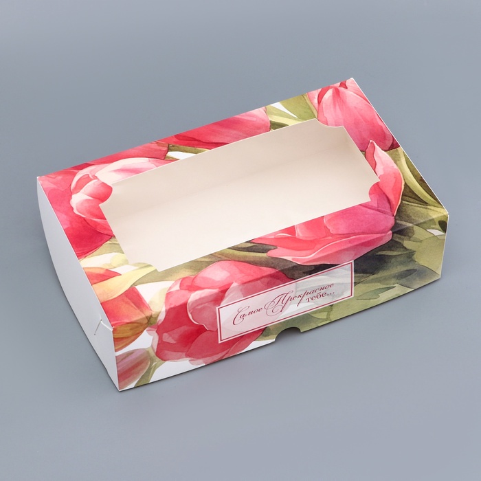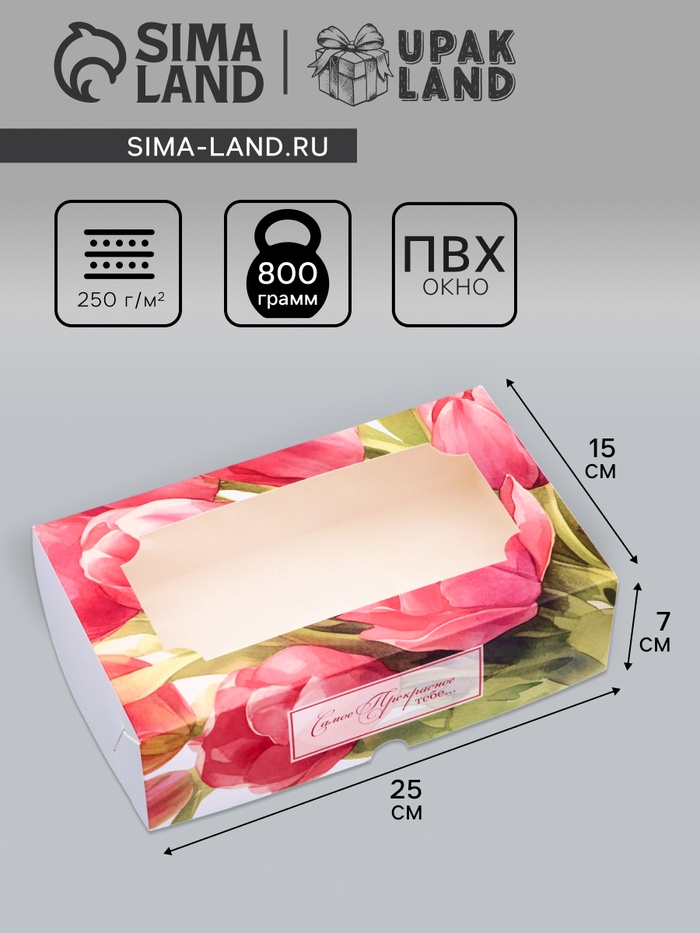 - Размер коробки составляет 25х15х7 см, что позволяет разместить внутри разнообразные кондитерские изделия: от небольших шоколадок до крупных конфет и даже пирожных.