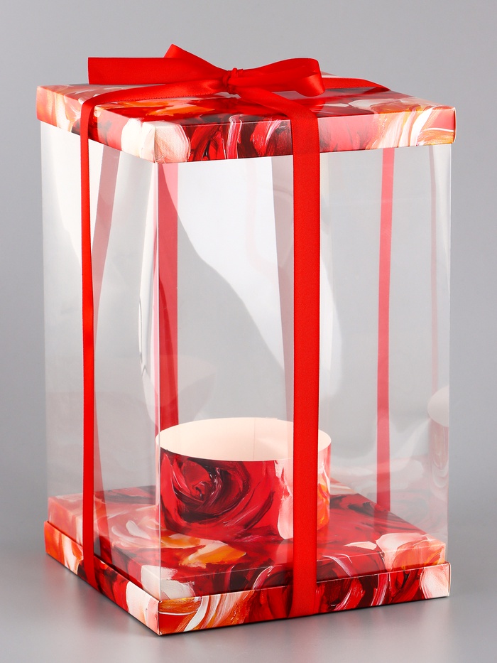 Красный цвет коробки символизирует страсть и праздник, что делает её идеальной для романтических подарков. Прямоугольная форма и прозрачное окошко подчеркнут красоту букета, а прочный материал ПВХ и картон обеспечат надёжность. Коробка легко складывается и не занимает много места при хранении.
