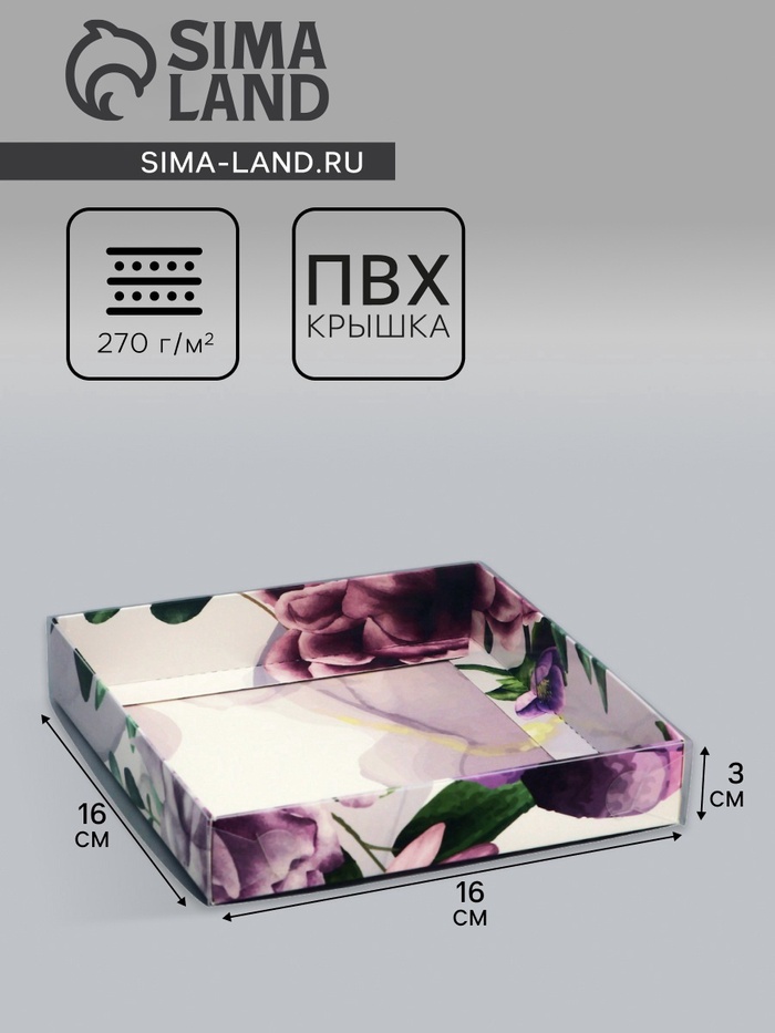 • Размер 16 х 16 х 3 см идеально подходит для размещения небольших сладостей, аксессуаров или сувениров. Прозрачная PVC крышка позволяет элегантно продемонстрировать содержимое, создавая эффект сюрприза и подчеркивая утонченность подарка.