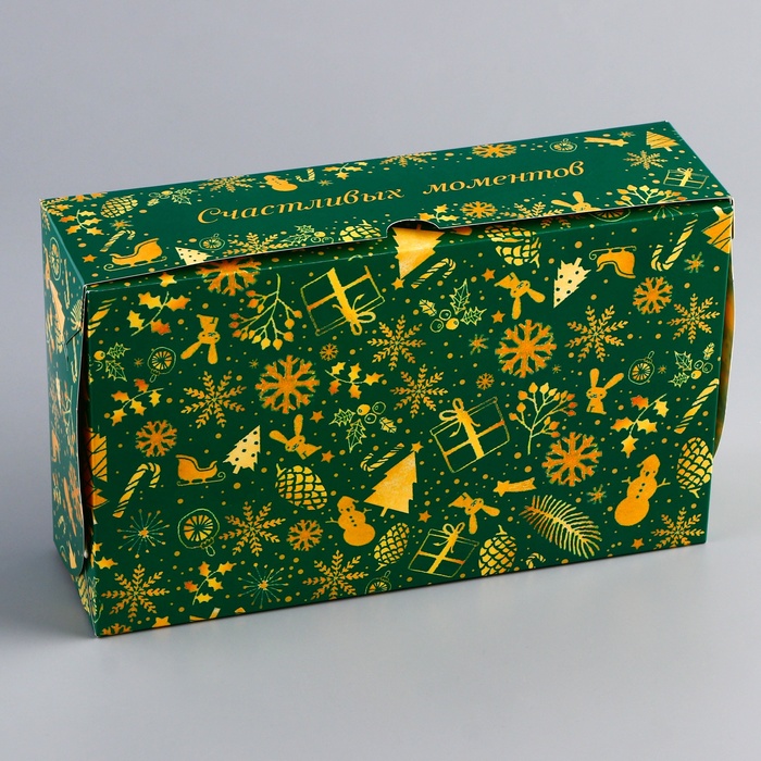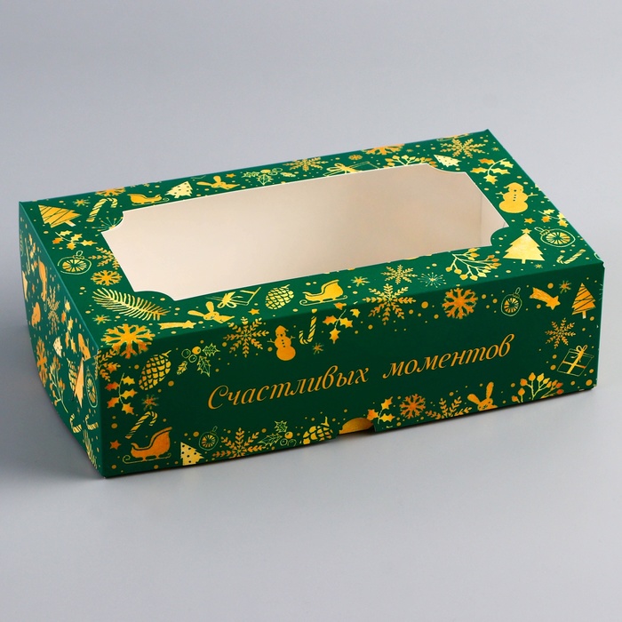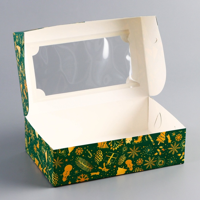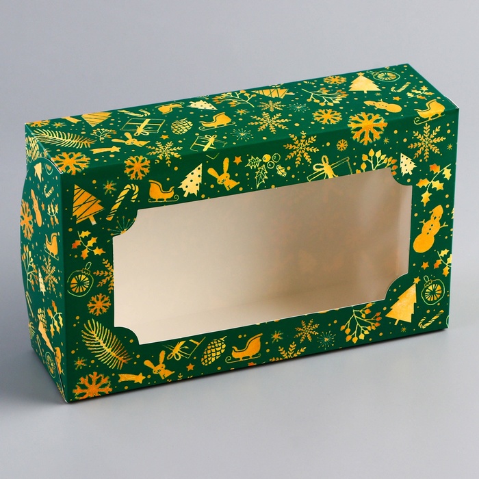 Новогодняя складная коробка с окном размером 25 х 15 х 7 см — это идеальная упаковка для праздничных подарков и угощений. Изготовленная из прочного картона, коробка украшена ярким зимним дизайном с новогодними мотивами, создавая атмосферу праздника.
