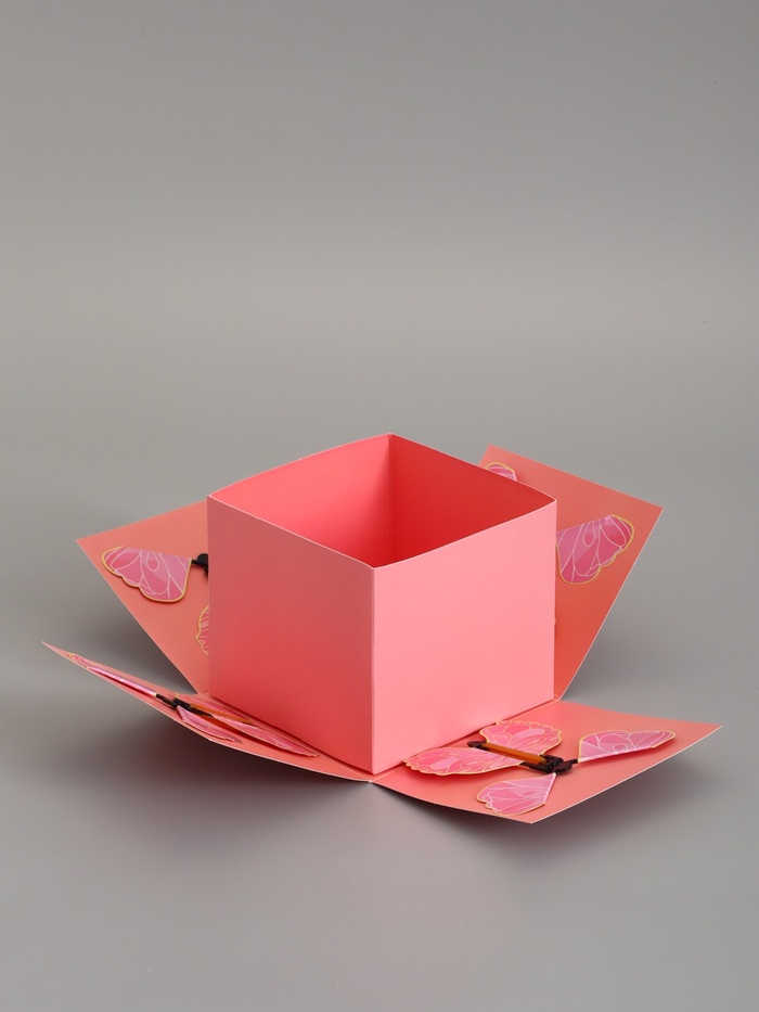 - Готовое решение для подарка: Конструкция уже включает встроенный механизм с бабочками, поэтому не требуется дополнительных элементов. Достаточно подготовить коробку и поместить подарок внутрь.